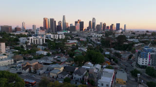 Aerial view of downtown Los Angeles skyline and residential area at sunset