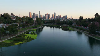 Aerial view of downtown Los Angeles skyline over Echo Park Lake at sunset