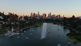 Aerial view of downtown Los Angeles skyline over Echo Park Lake with fountain at sunset