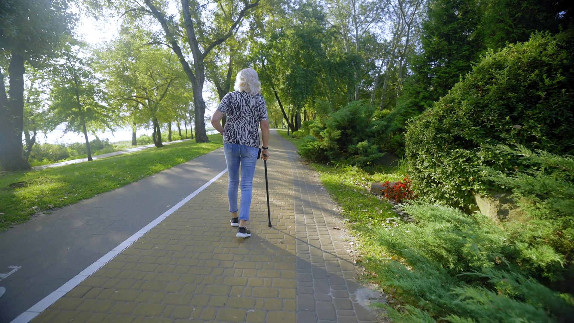 Rear View Of Relaxed Attractive Senior Woman On Retirement With Walking Cane Strolling On Park Alley Enjoying Leisure And Beautiful Summer Nature In Rays Of Rising SunÂ