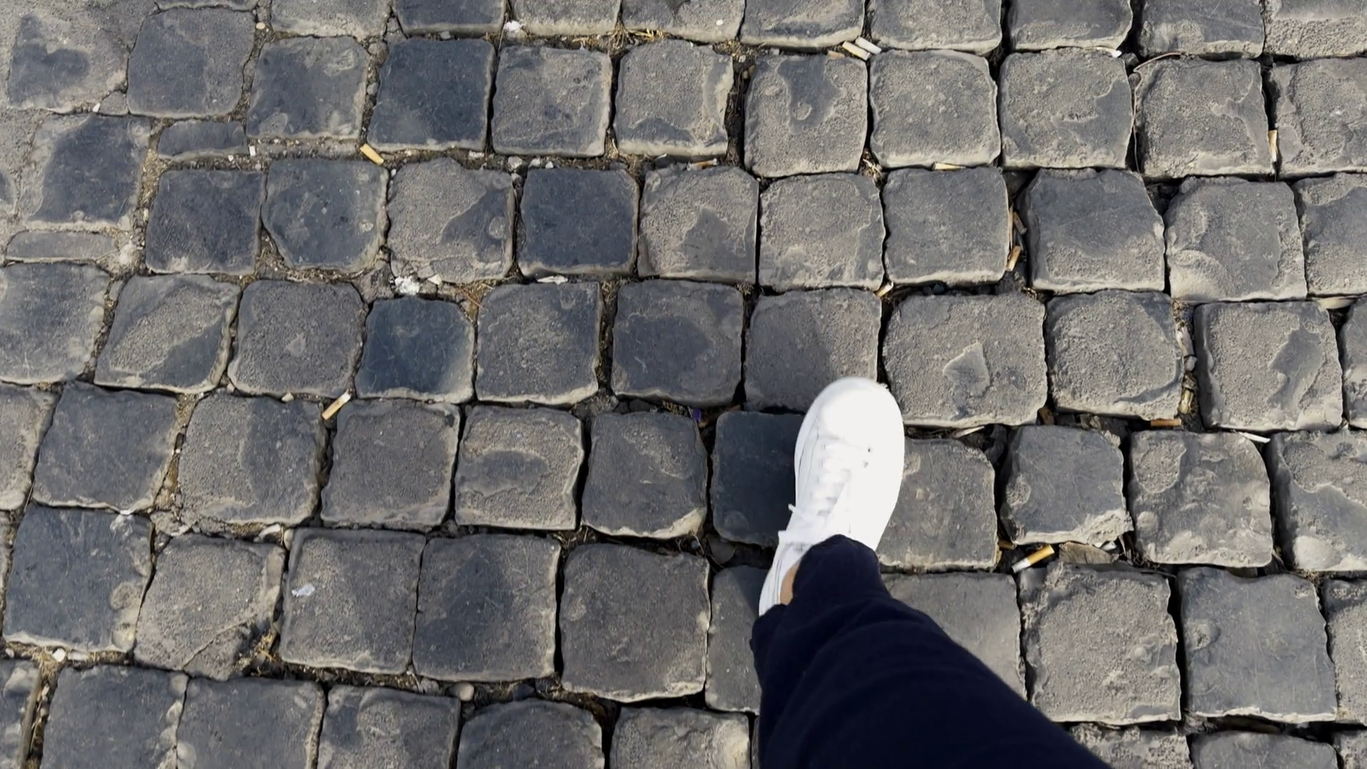 Single White Sneaker On Gray Cobblestone Pavement Walk Woman Tourist Person Wearing Dark Blue Pants Walking Urban Exploration City Street Shoe Stepping On Rough Cobblestone GroundÂ